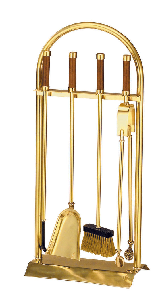 Set attrezzi in ottone con manici in legno.