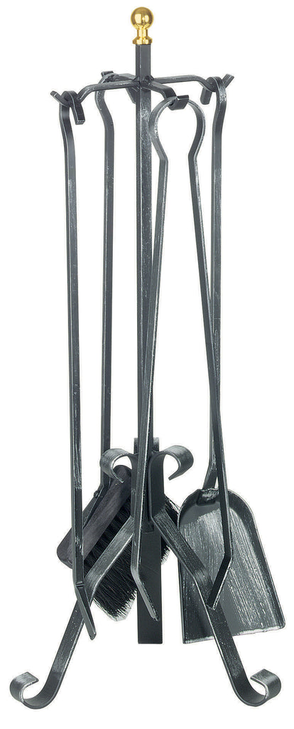 Set attrezzi in ferro battuto laccato di nero, patinato e con la sfera di color ottone.